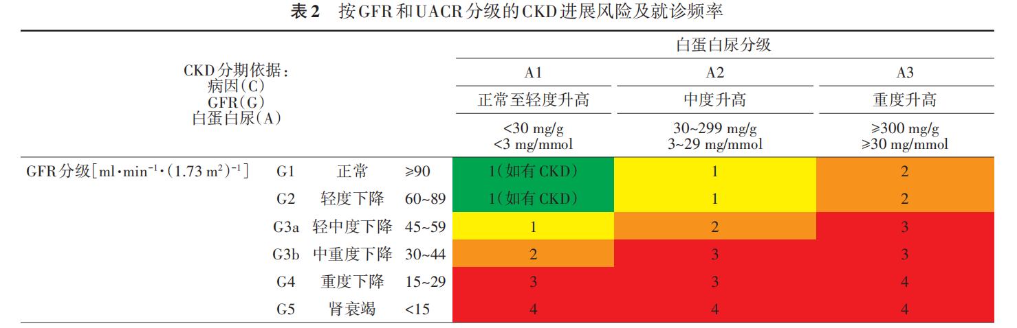 注:GFR為腎小球濾過率;UACR為尿白蛋白/肌酐比值;CKD為慢性腎臟?。槐砀裰械臄?shù)字為建議每年復(fù)查的次數(shù);背景顏色代表CKD進展的風險:綠色為低風險,黃色為中風險,橙色為高風險,紅色為極高風險。