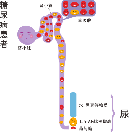 1,5-AG在腎小球中排出,卻被腎小管近99.9%重吸收【2】。這種重吸收機制與尿葡萄糖相同,當腎小管上的尿葡萄糖過量時,則1,5-AG的重吸收就會被競爭性抑制【4,5】。糖尿病患者在高血糖狀態下終尿排泄的1,5-AG增加導致了血清的1,5-AG減少。