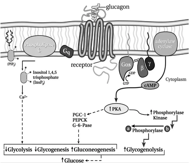 胰高血糖素是一種反調節激素,刺激肝臟葡萄糖的產生,以避免低血糖。胰高血糖素受體位于肝細胞上,在腎臟、心臟、胃腸道、脂肪組織、大腦和脾臟中也發現了胰高血糖素結合位點。根據對狗的研究,大約17%的胰高血糖素被腎臟降解,20%到25%在肝臟中降解。胰高血糖素對低血糖反應的釋放已經被很好地證實,并通過自主、內分泌和旁分泌機制介導,可能還通過α細胞直接感知血糖水平。細胞分泌胰高血糖素的確切分子機制尚不完全清楚,但涉及三磷酸鉀腺苷(KATP)通道和鈣通道。