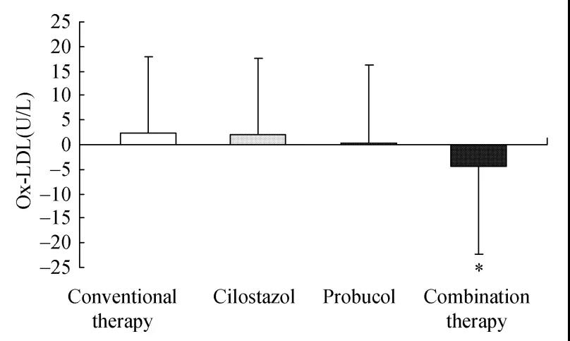 2008年10月至2009年8月在北京大學(xué)第一醫(yī)院、北京協(xié)和醫(yī)院、北京醫(yī)院、北京解放軍總醫(yī)院、北京解放軍第二炮兵總醫(yī)院的多中心臨床研究,165名年齡在40-75歲之間的2型糖尿病(T2DM)和ASO患者,隨機(jī)分配接受常規(guī)治療 (47名)、常規(guī)和西洛他唑治療(37名)、常規(guī)和普羅布考治療(43名)、常規(guī)以及西洛他唑和普羅布考的聯(lián)合治療 (38名)。治療12周后,聯(lián)合治療組(Combination therapy)的血清ox-LDL水平比常規(guī)治療(Conventional therapy)具有顯著的降低趨勢(P = 0.065),降低了4.47±17.84U/L[8]。