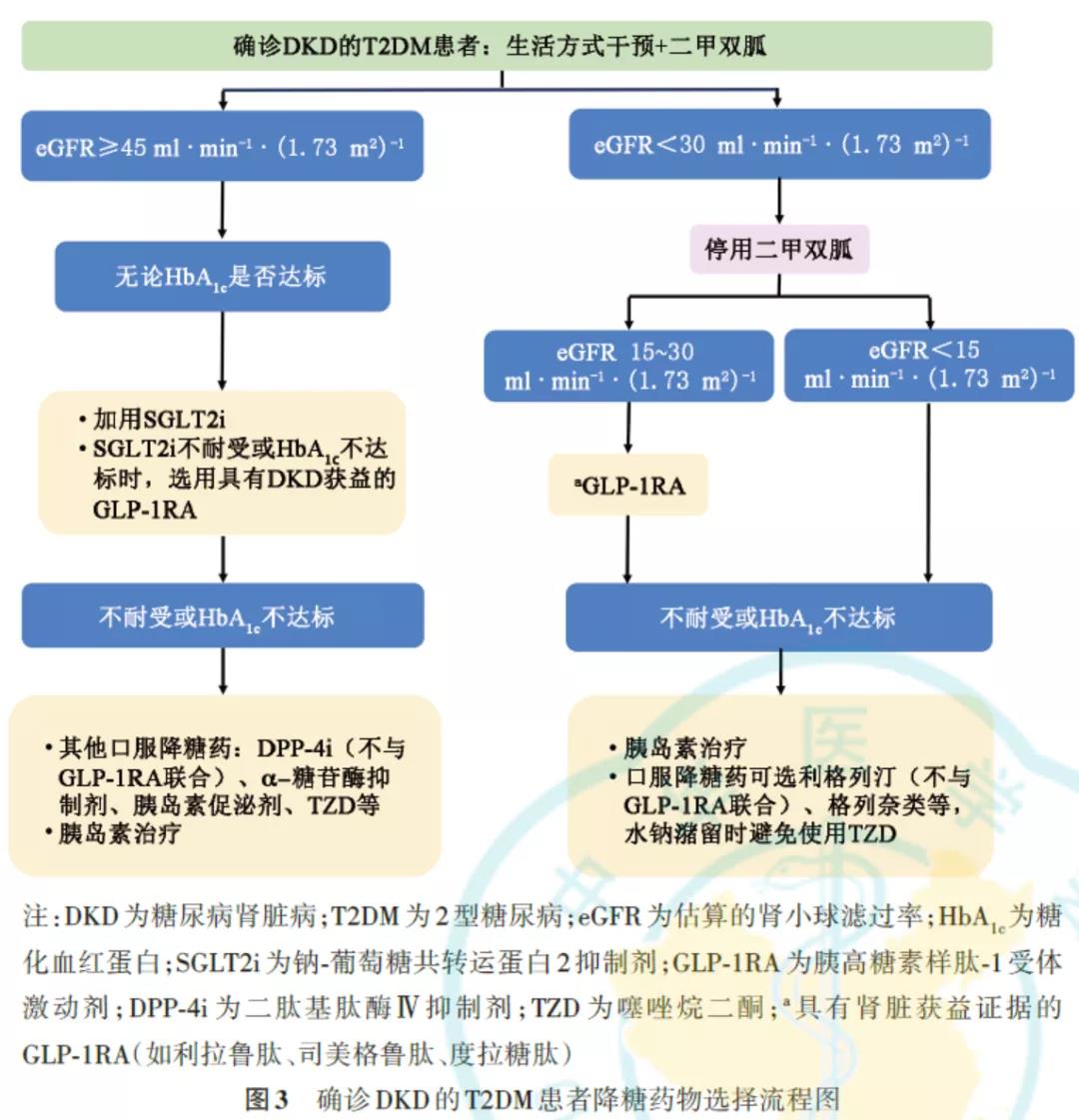 2.推薦DKD患者的LDL?C目標值<2.6 mmol/L,其中動脈粥樣硬化性心血管病(ASCVD)極高危患者的LDL?C應<1.8 mmol/L。DKD患者每年應至少檢查1次血脂,起始降脂藥物治療者應1~3個月后復查,之后每3~12個月復查。
