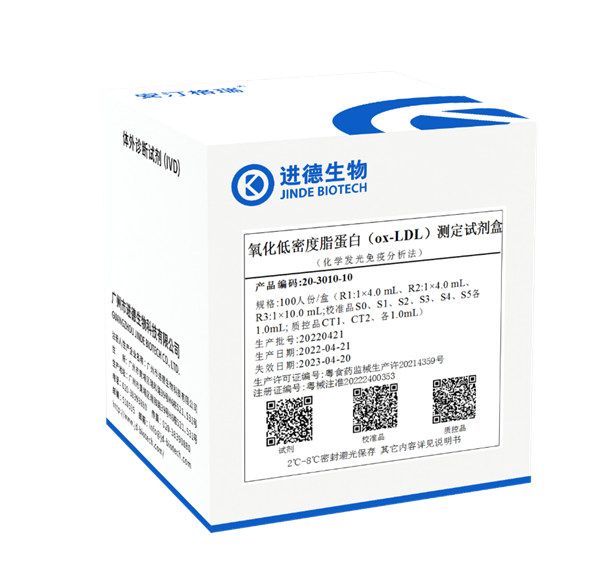 本期帶來由進德生物自主研發(fā)生產(chǎn)的一款重磅產(chǎn)品氧化低密度脂蛋白(ox-LDL)測定試劑盒(化學(xué)發(fā)光免疫分析法),目前已獲批上市,注冊證號粵械注準(zhǔn)20222400353,該款產(chǎn)品為全球率先研發(fā)的化學(xué)發(fā)光法氧化低密度脂蛋白(ox-LDL)測定試劑盒。