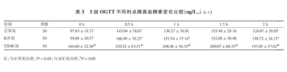 正常組胰島素平均最高值在糖負荷后1h,IGT組和T2DM組均延后,平均最高值出現在1.5h。T2DM組在各時點平均胰島素均低于正常組,在0.5h、1h、1.5h和2h的平均胰島素均低于IGT組,IGT組在0.5h低于正常組,在1h、1.5h和2h均高于正常組,差異均有統計學意義(P<0.05)。