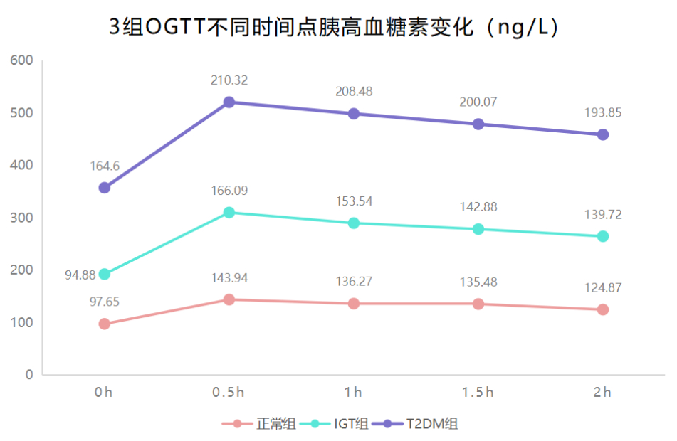 T2DM組在各時點平均血糖均高于正常組,在1h、1.5h和2h的平均血糖均高于IGT組,IGT組在0.5h、1h、1.5h和2h的平均血糖均高于正常組,差異均有統計學意義(P<0.05)。