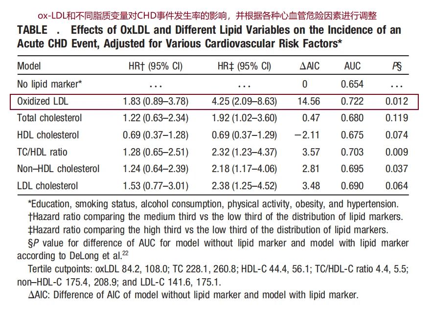 ②血漿中的循環ox-LDL是識別冠心病風險的一個有用的標志物。在同一模型中同時評估ox-LDL時,即使在調整了所有傳統心血管風險因素和TC/HDL-C比值(傳統血脂變量中最有力的風險預測因素之一)后,ox-LDL仍能預測未來的冠心病事件。