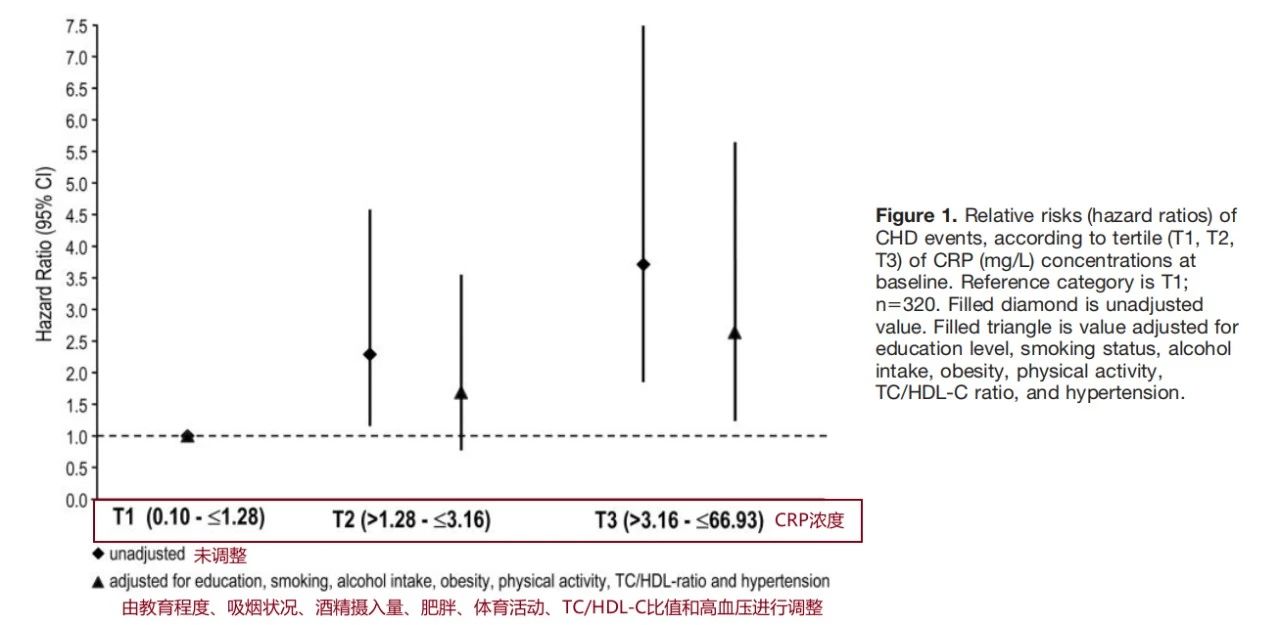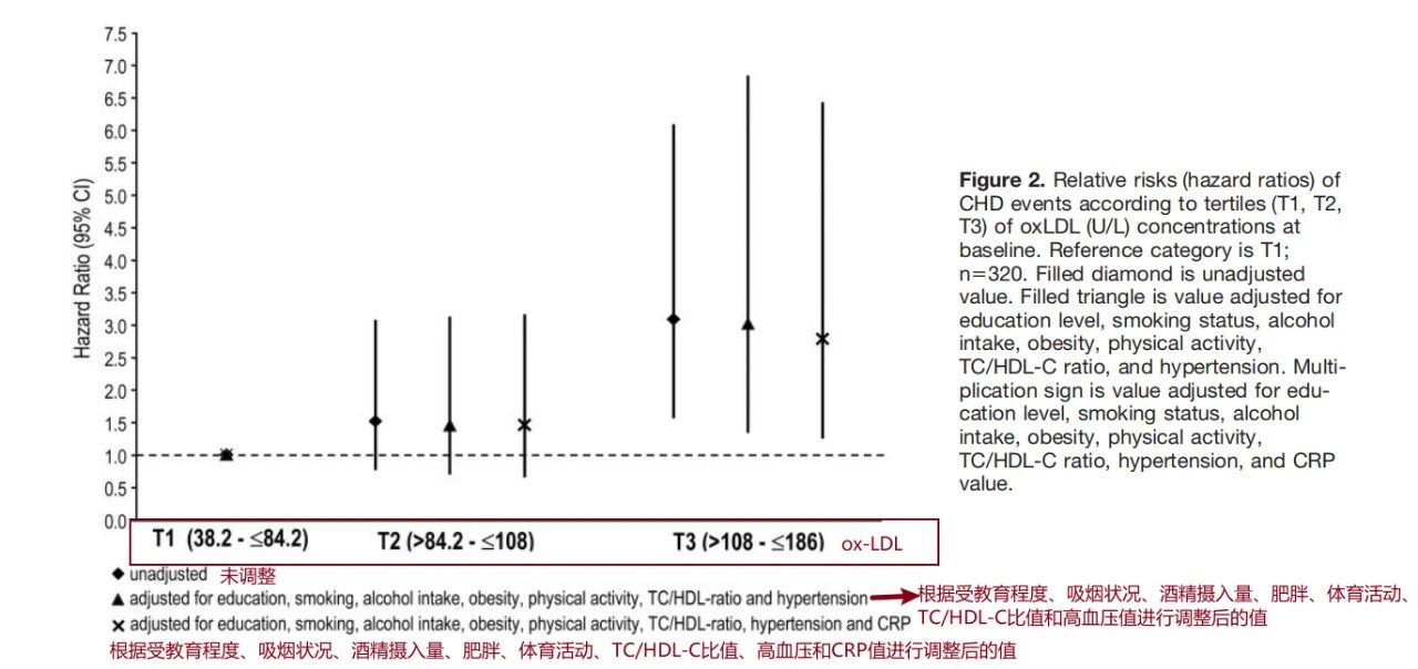 研究顯示,在同一模型中同時評估ox-LDL和CRP時,即使經過多變量調整,這兩個參數仍可預測未來的冠心病事件。與CRP相比(2.30;95%CI,1.06至5.02;P=0.036;如圖1),血漿ox-LDL的上三分層HR略高(2.79;95%CI,1.21至6.42;=0.016;如圖2)。